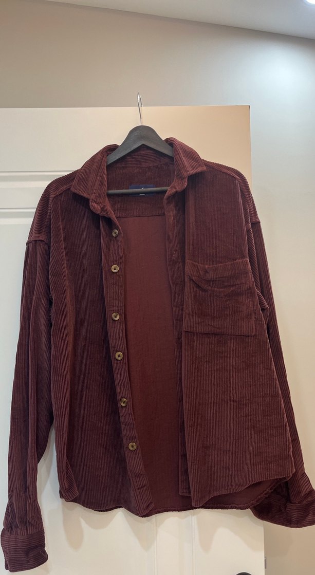 Bordo kadife gömlek, düğmeli, notched lapel yakalı, uzun kollu ve salaş kesimdir. Günlük kullanıma uygun cepli ve rahat bir modeldir.