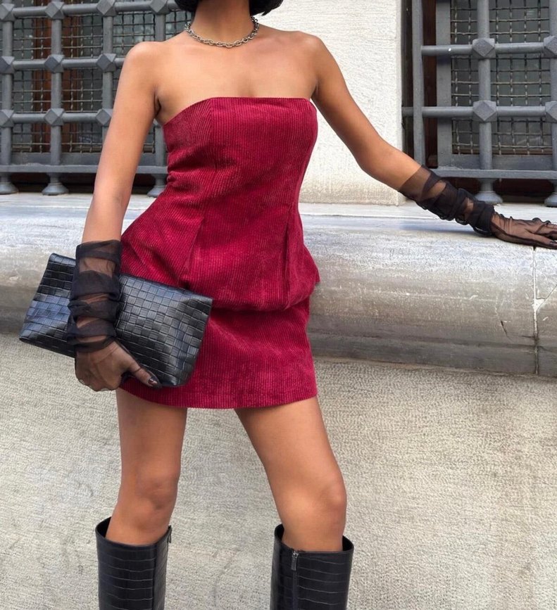 Bordo süet kumaştan, straplez yaka ve kemerli, mini boyda, vücuda oturan elbise. Cesur sokak stili ve romantik akşamlar için uygun.