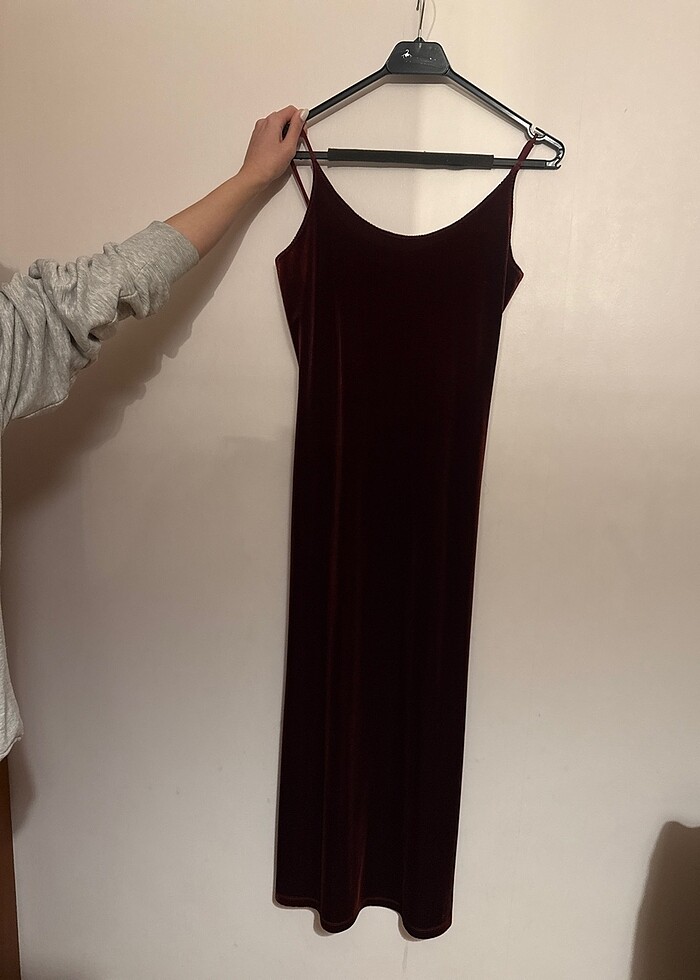 Bordo kadife, 38 beden ip askılı gece elbisesi, askıdan etek ucuna boyu 130, tek taraf yırtmaclı boyu 40 cm. Hiç kullanılmadı.Askinın uzatma kısaltma ayar yeri var.
