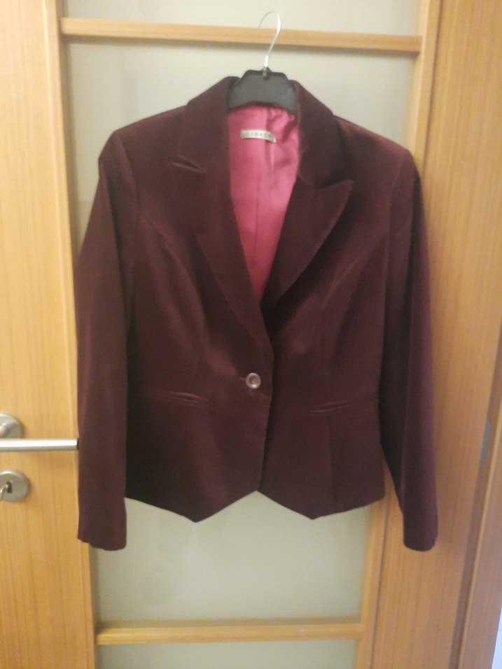 Bordo renkli kadife kumaştan yapılmış kadın blazer ceket. Düğmeli, klasik yakalı ve midi boyda, ofis için uygun şık bir parça.