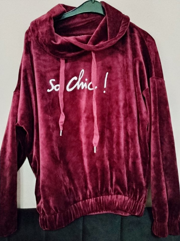 Bordo kadife kumaştan, bol kesim, uzun kollu ve yuvarlak yakalı sweatshirt. Parlak yüzeyli, baskılı ve kürk detaylıdır. Parti ve sokak stili için uygundur.