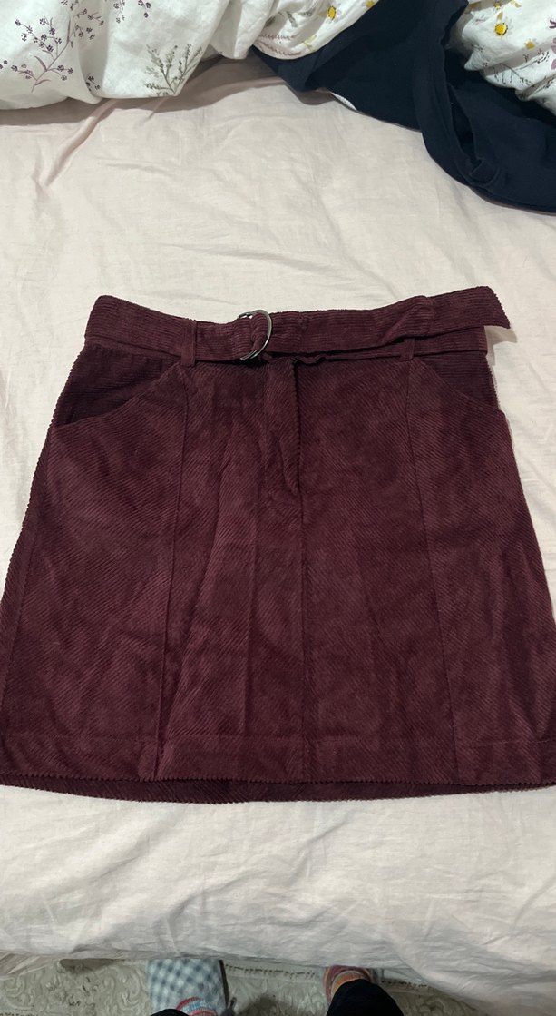 Bordo kadife kemerli, normal uzunlukta ve dar kesim mini etek. Rahat ve şık sokak stili veya ofis kullanımı için uygun. Sadece bir kere giyildi tertemiz hiçbir sorunu yok
