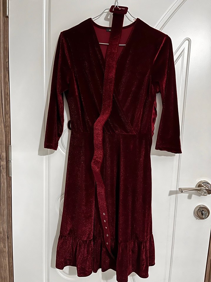Bordo kadife kumaştan, uzun kollu, midi boy ve volanlı etek ucu ile fit kesim goth Paris tarzı elbise. Hiç giymedim
