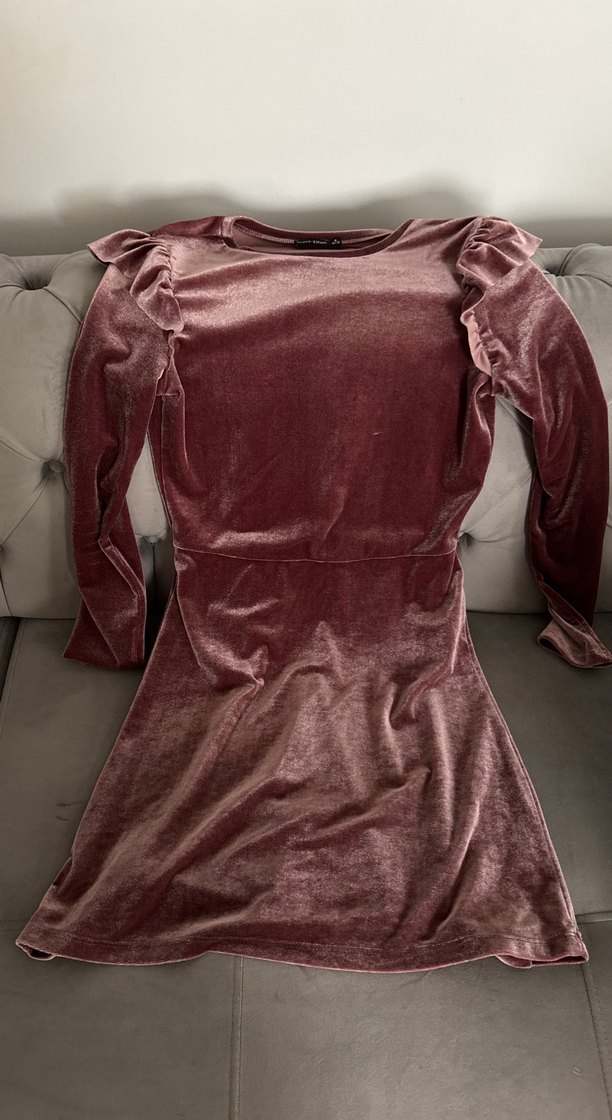 Bordo kadife kumaştan, drapeli detaylı, uzun kollu ve yüksek yakalı, vücuda oturan midi elbise. Romantik akşamlar için uygundur.