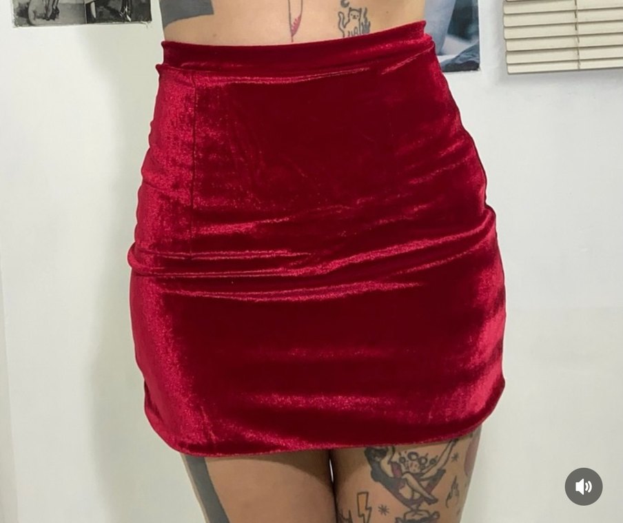Koyu kırmızı kadife, düz desenli ve vücuda oturan mini etek, cesur gotik tarzıyla romantik akşamlar için ideal. Zahmetsiz şıklık sunar. Yılbaşı kombinizi kurtarabilir bu parça.