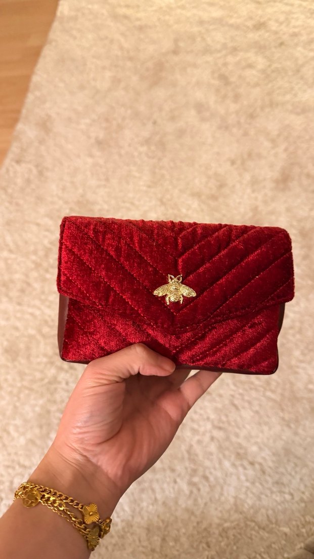 Bordo kadife çanta, parlak doku, nakış detaylı ve kemerli tasarımla romantik akşamlar için uygun.