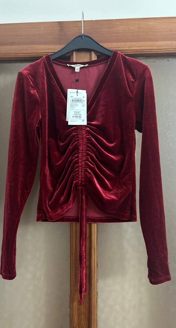 Bordo kadife bluz, uzun kollu, V yaka ve ön kısmında pilili detaylara sahip. Yumuşak süet kumaştan, romantik akşamlar için uygundur.