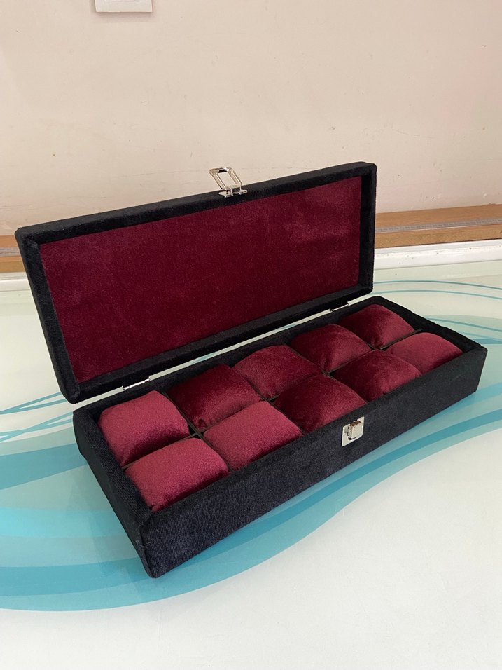 Bordo kadife kaplı, yumuşak dolgulu bölmeleriyle saat ve takılarınızı düzenlemek için kutu. Siyah dış yüzey ve güvenli kilitli kapanışı bulunur. ️