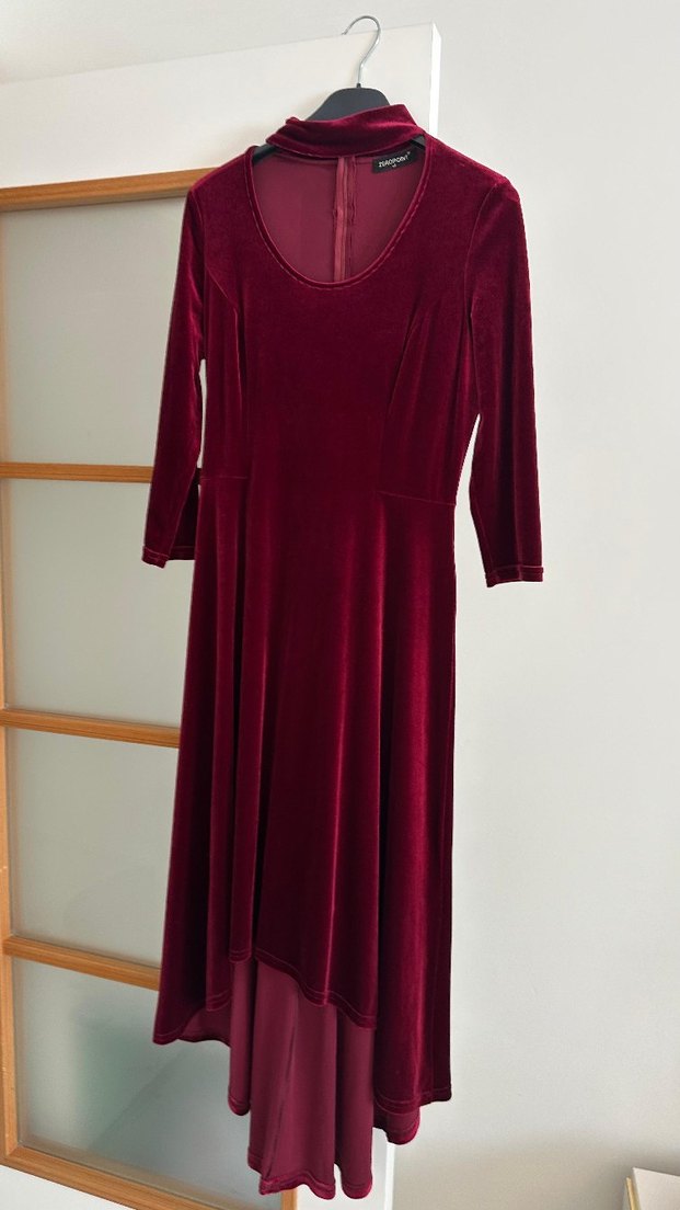 Bordo kadife uzun elbise, yüksek yakalı ve uzun kollu, yumuşak süet kumaştan drapeli tasarıma sahip modern klasik tarzda. Romantik akşamlar için ideal. çok rahat ve esnektir