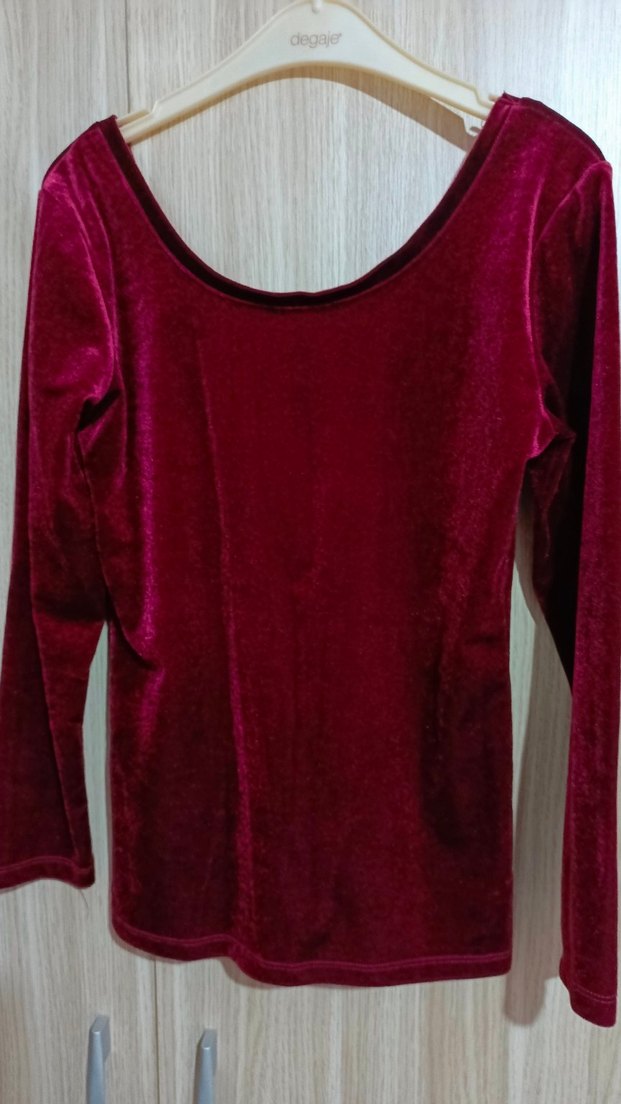 Bordo kadife kumaştan, uzun kollu ve yuvarlak yakalı, vücuda oturan kadın bluz. Drappeli tasarımıyla cesur ve gotik stil için uygundur, romantik akşamlar için ideal.