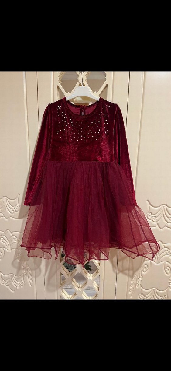 5-6-7 uyumlu Bordo kadife kumaştan, uzun kollu ve yakasında payet detaylı kız elbisesi. Nakışlı desenli, kat kat etekli ve klasik şıklıkta bir tasarım.