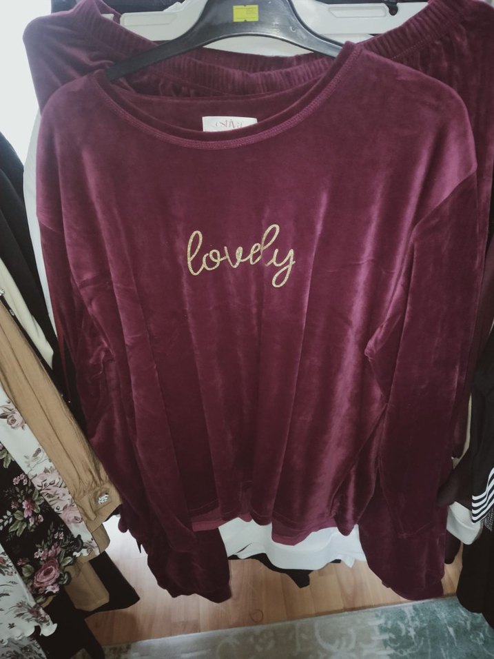 Bordo renk, uzun kollu ve bol kesim, yumuşak ve sıcak kumaştan. Önünde 'lovely' yazılı baskı, rahat ve şık sokak stili için uygundur.