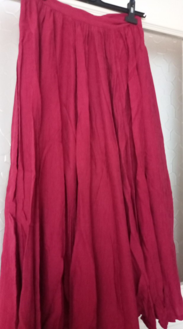 Bordo renkli, kadife kumaştan salaş kesim ve drapeli uzun etek. Bohem tarzıyla günlük kullanıma uygundur. Geçen yaz alındı aldığım fiyata veriyorum boy 88 cm astarlı ağar bir parcadır etiketli sıfır üründür