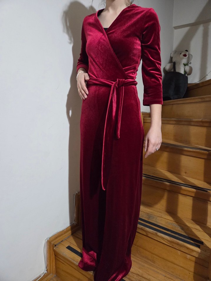 Bordo kadife kumaştan, V yaka ve üç çeyrek kollu, klasik şıklıkta, drapeli ve vücuda oturan uzun tulum.