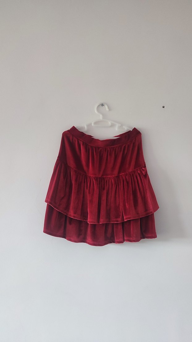 Bordo renkli kadife kumaştan, bol kesim ve volan detaylarına sahip, renkli bohem tarzda kız eteği.