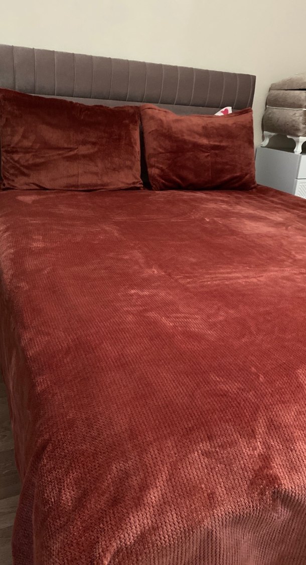 Bordo renkte, kadife dokulu ve desensiz yumuşak bir yatak örtüsüdür. Yatak odasına sıcaklık ve şıklık katar. ️