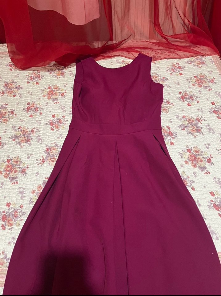 Bordo renk, Sentetik kumaştan üretilmiş olup, drapeli detaylarıyla düğünler için uygundur. Ürünü 1 kere kullandım temiz ve yenidir defosu yoktur. Diz boydur.