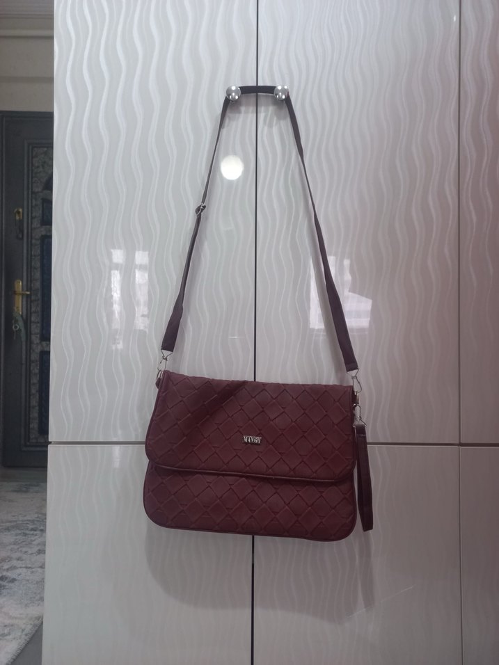 Bordo renkli, sentetik kumaştan yapılmış, kemerli ve minimal tasarımlı kadın askılı çanta, günlük sokak modası için uygundur.