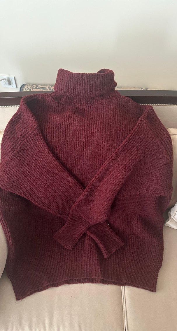 Bordo renkli, balıkçı yaka ve uzun kollu, örgü dokulu, kalın kazak. Rahat ve sade tarz için uygundur.