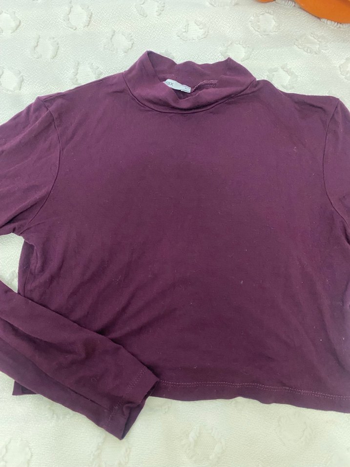 Bordo renkli, balıkçı yaka ve uzun kollu, ince keten kumaştan yapılmış, normal midi boyda, sade ve desen içermeyen, günlük kullanıma uygun kadın bluz.