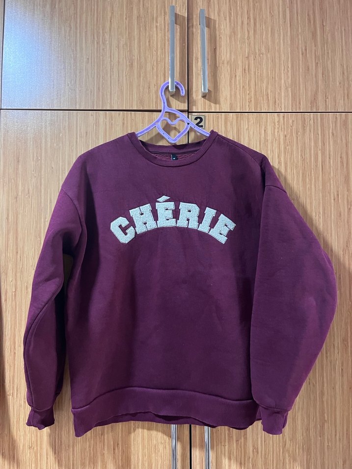 Bordo renkte, bisiklet yaka ve uzun kollu kadın sweatshirtü. Rahat kesimli, örgü dokulu ve parlak "CHÉRIE" baskılıdır. Günlük rahat stil için uygundur.