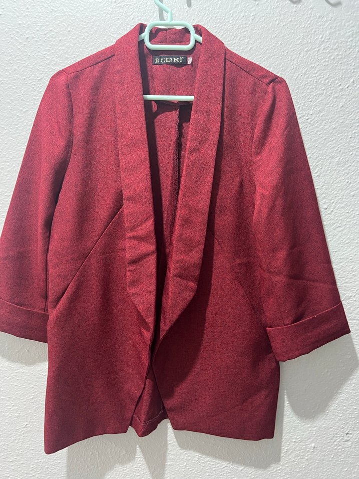 Bordo renkli, uzun kollu kadın blazer ceket. Keten kumaştan, parlak görünümlü ve midi boyda, ofis be günluk kullanim için uygun.