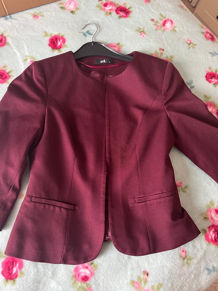 Bordo renk, düğmeli ve uzun kollu kadın blazer ceket. Sentetik kumaştan, klasik ofis stili için uygun, normal uzunlukta ve kesimi vücuda oturan model.