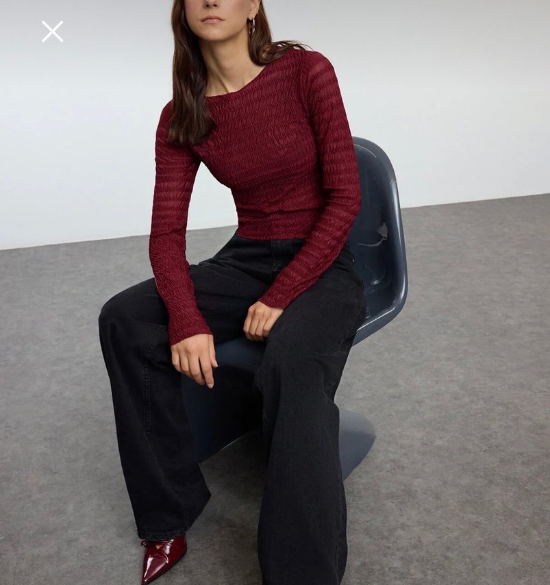 Bordo renkli, yüksek yakalı ve uzun kollu örgü dokulu kadın bluz. Rahat kesimi ve normal boyuyla ofis için uygundur.