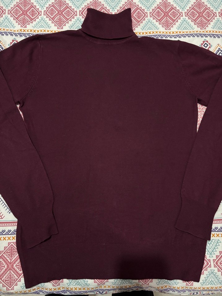 Bordo renkli, boğazlı ve uzun kollu, yumuşak yün kumaştan yapılmış, rahat ve şık günlük kullanıma uygun ince triko kazak.
