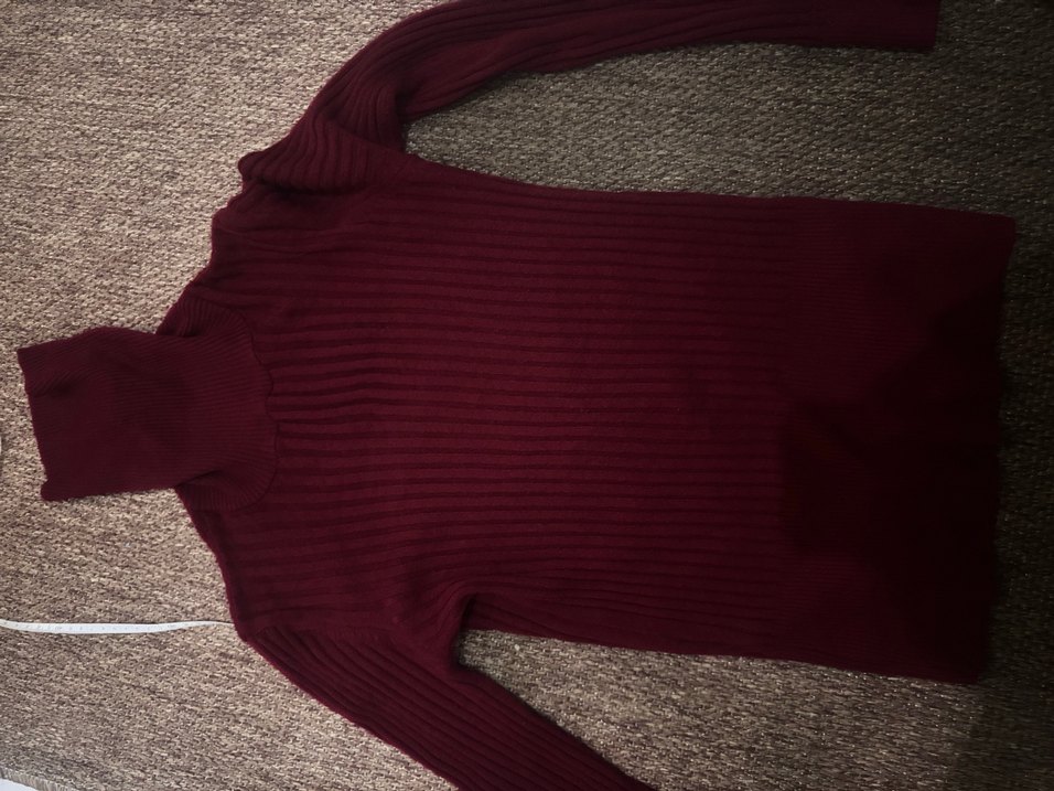 Bordo renkte, boğazlı ve örgü dokulu, yün kumaştan yapılmış, dar kesim ve uzun kollu midi boy kazak.