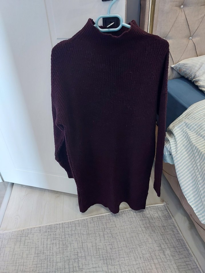 Bordo renk, boğazlı ve uzun kollu kadın triko. Yün malzemeden, örgü dokulu ve midi boyda, rahat ve şık günlük kullanım için uygundur.
