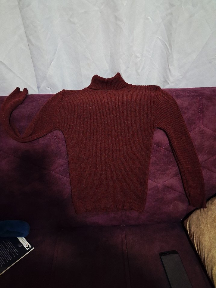 Bordo renkte, boğazlı ve uzun kollu, yün dokulu, vücuda oturan kadın triko kazak. Düz, rahat ve günlük kullanıma uygun.