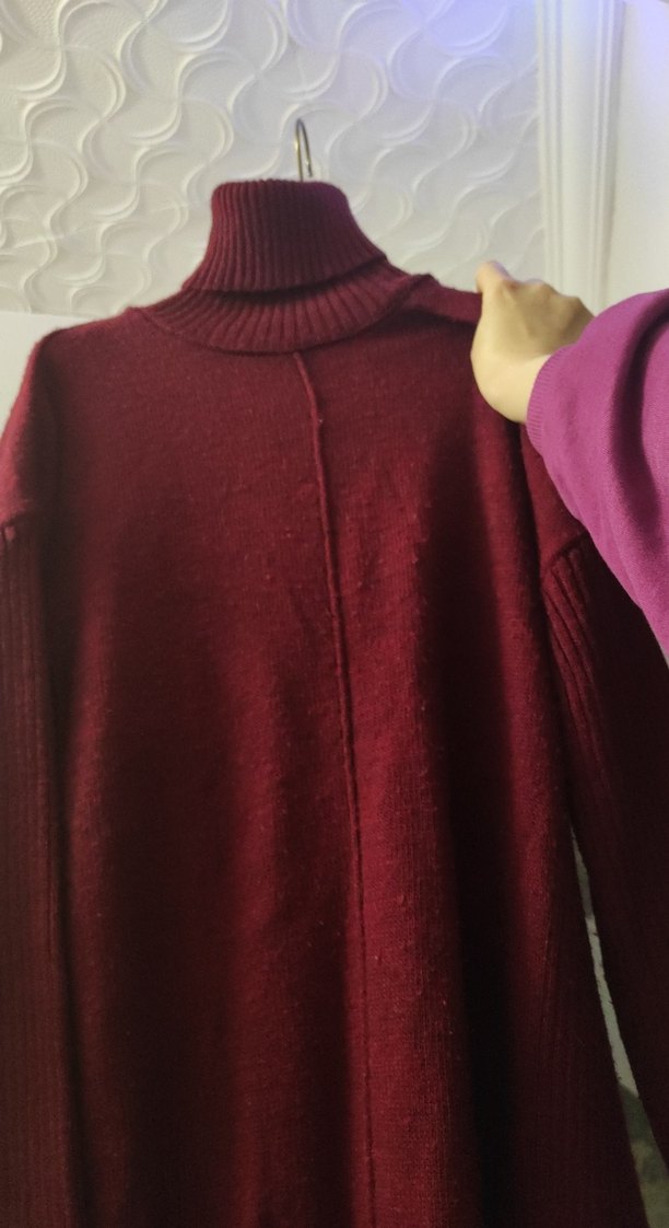 Bordo renkli, boğazlı ve uzun kollu, triko kumaştan üretilmiş, günlük kullanıma uygun, vücuda oturan kadın kazak.