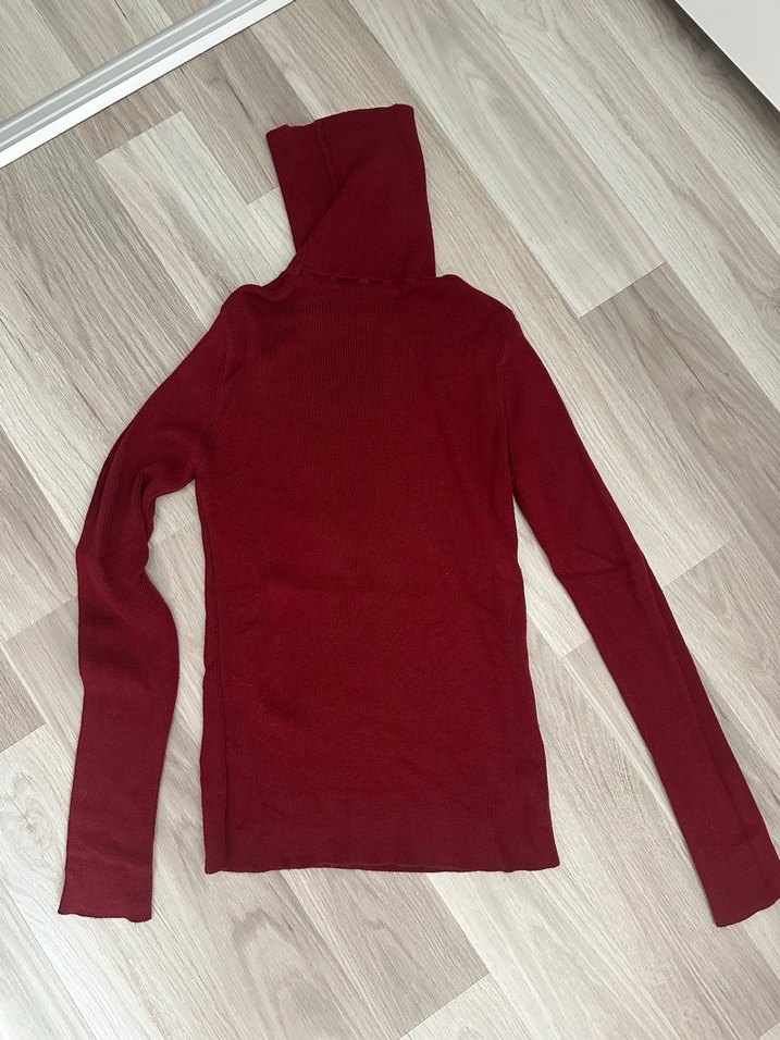 Bordo renkli, boğazlı ve uzun kollu kadın triko kazak. İnce ve vücuda oturan kesimiyle midi boyda, sentetik örme kumaştan üretilmiştir. Rahat ve sade tarzda, günlük kullanıma uygundur.