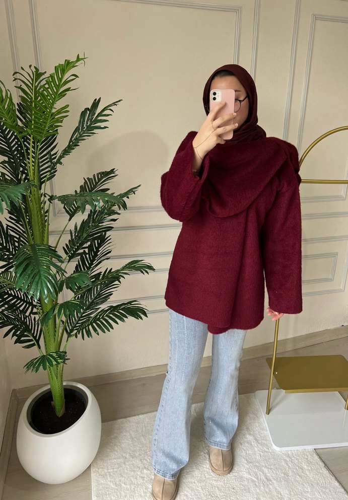 Bordo Kadın Boğazlı Tüylü Salaş Kaban