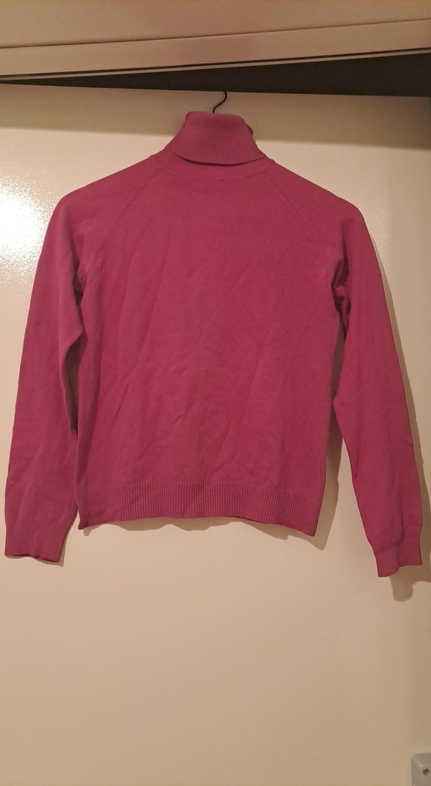 Mor renkli, boğazlı ve uzun kollu, vücuda oturan kadın kazak. Yumuşak ve sıcak kumaştan, sade ve minimal tarzda, günlük kullanıma uygun midi boyda.