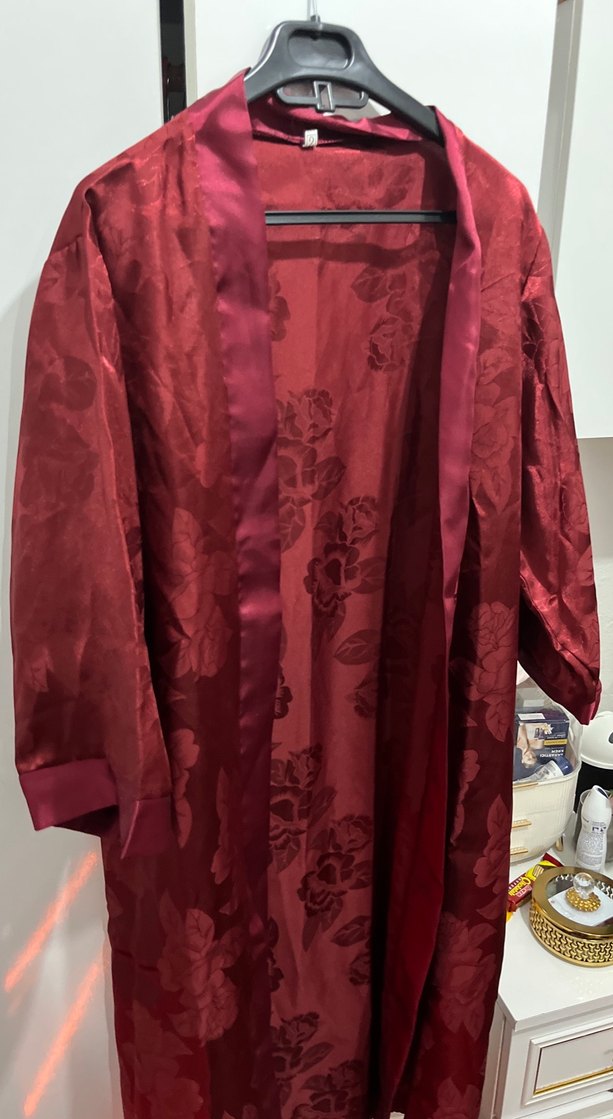 Bordo renkli kadın sabahlık, uzun kollu ve bol kesimdir. Orta boy uzunluğu ve bohem tarzıyla rahat bir kullanım sunar.