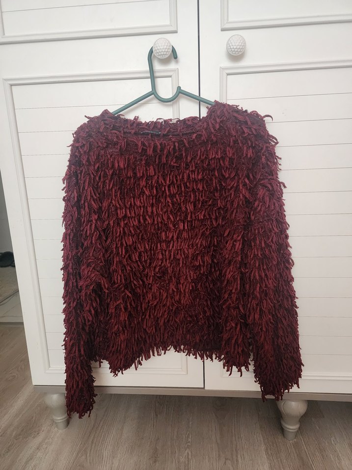 Bordo renk, uzun kollu, yuvarlak yaka, bol kesim, dokulu örgü kumaştan kadın bohem tarzı kazak. Günlük kullanıma uygundur.