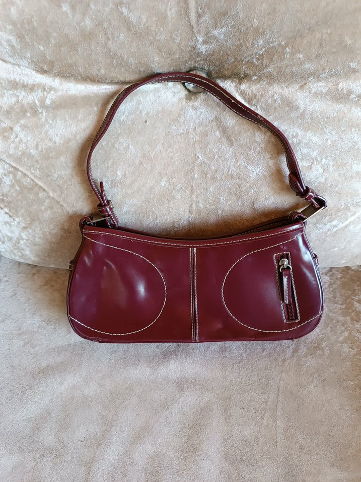 Bordo renkli, parlak deri kadın çantası. Minimalist tarzda, fermuarlı ve günlük sokak kullanımı için uygundur. (Az kullandı) Eni 30 cm. çanta sapı 25 cm.