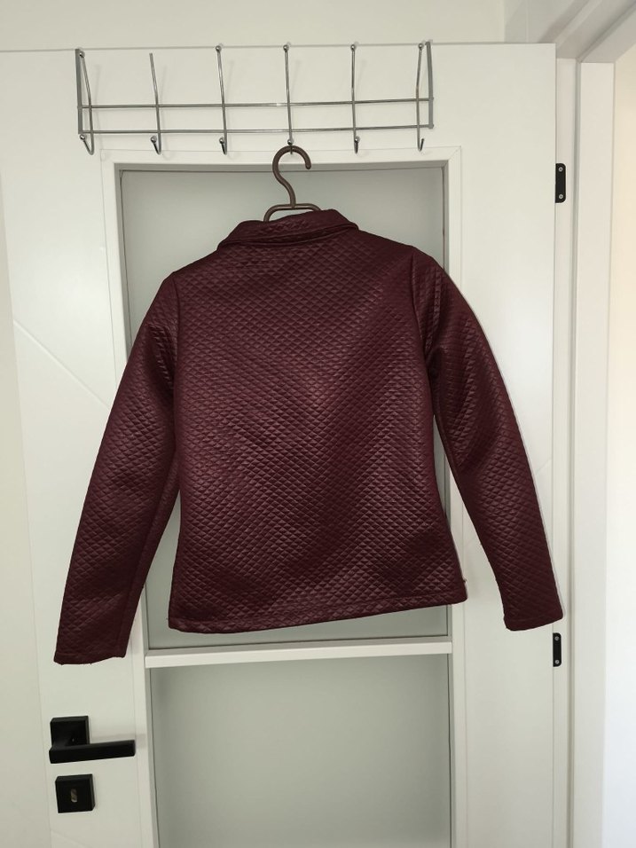 Bordo, yüksek yakalı, uzun kollu, midi boy, dar kesim kadın ceket. Günlük kullanıma uygun şık ve sade tasarım.