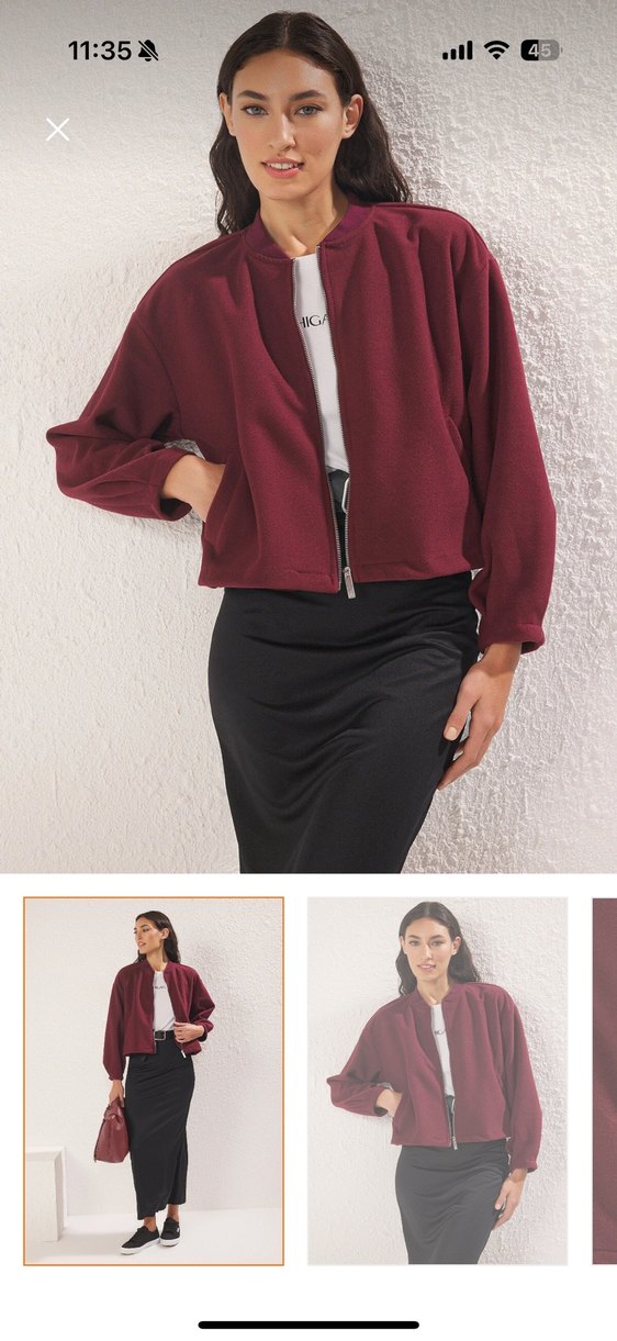 Bordo renkli midi ceket, bol kesim, uzun kollu ve yuvarlak yakalıdır. Yumuşak kumaştan günlük kullanıma uygundur, sade ve şık bir tarz sunar. Kaşe