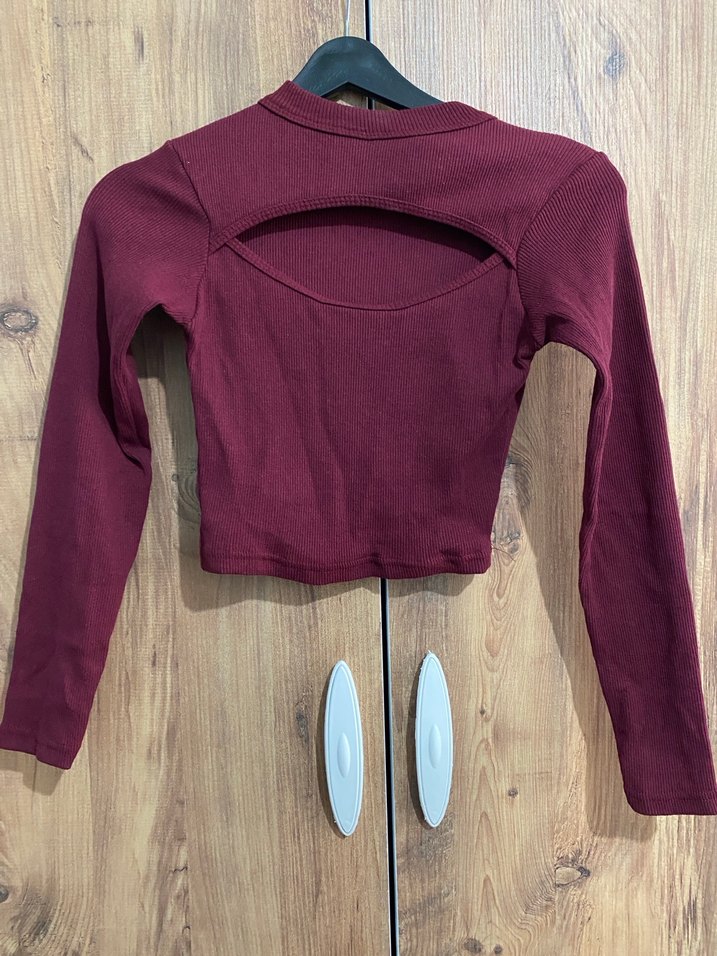 Bordo renkli, uzun kollu, kısa kesim, triko kumaştan kadın sweatshirt. Sırtında kesik detayı bulunan, sportif ve sokak stili uyumlu bir parça. Ürün hiç kullanılmadı hiçbir sorunu yoktur.