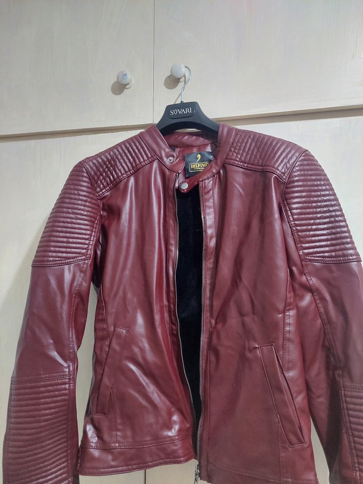 Bordo parlak deri biker ceket, uzun kollu ve fermuarlı. Notlu yakalı, normal midi boy, sokak stiline uygun şık kesim.