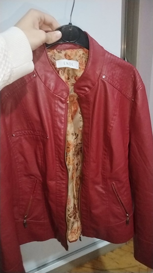 Bordo renkli deri ceket, fermuarlı ve yakası çıtçıtlıdır. Parlak yüzeyli, bol kesim ve uzun kolludur. 42 boyda, desen içermeyen günlük ve sokak tarzı için uygundur.