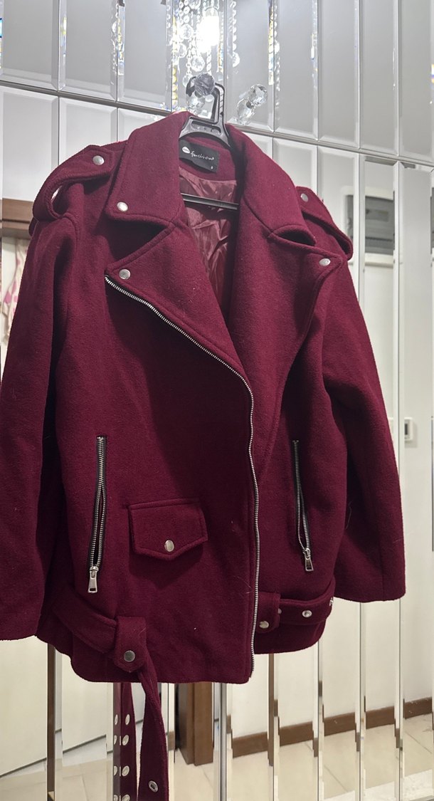Bordo kadın deri ceket, notched lapel yaka, fermuarlı detaylar ve bol kesimlidir. Yumuşak ve sıcak kumaştan, rahat sokak tarzına uygundur.
