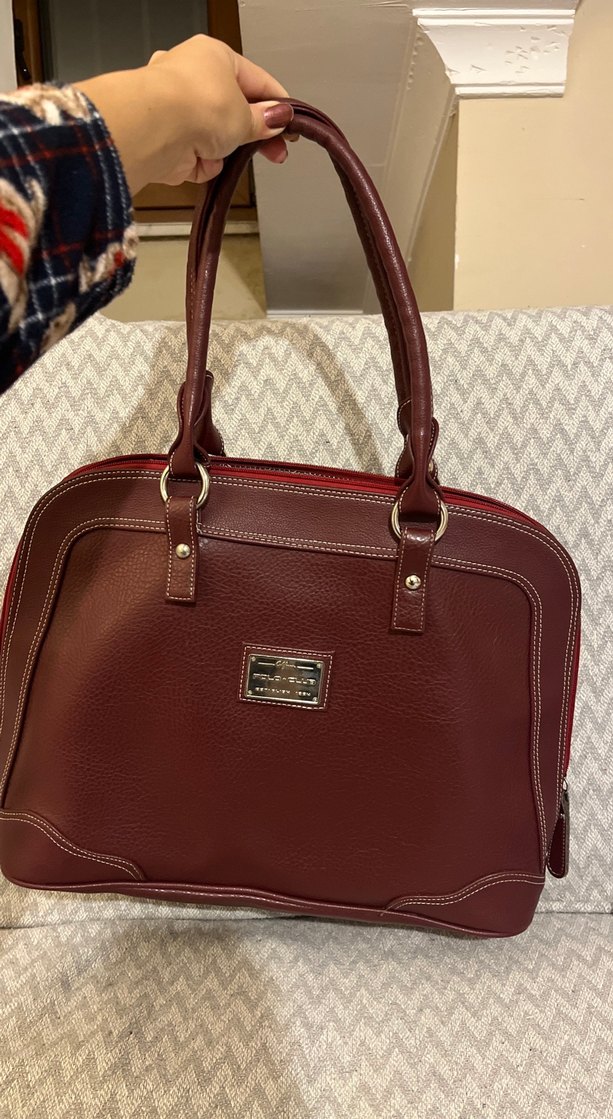 Bordo renkli, parlak görünümlü deri çanta, baskılı desene ve fermuarlı kapamaya sahip, modern klasik ve Paris tarzını yansıtıyor.