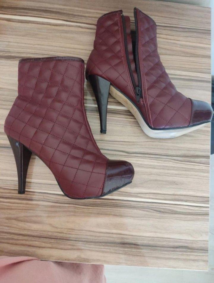 Bordo deri kadın botlar, kareli desenli ve fermuarlı tasarımıyla, stiletto topuklu ve cesur bir günlük stil sunar.