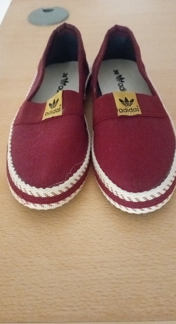 Bordo kadın espadril, dolgu topuklu ve kauçuk tabanlı, sade tasarım ve adidas logosu ile renkli, rahat bir görünüm sunar.