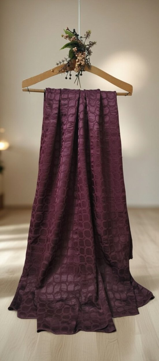 Bordo renkte, kadife dokulu, drapeli tasarıma sahip kadın şalı, rahat ve bohem bir stil sunar.