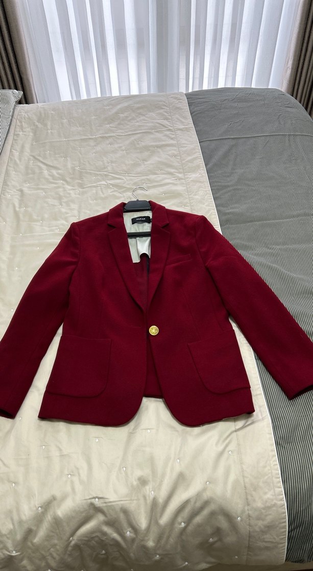 Bordo renkli, tek düğmeli, klasik yaka blazer ceket. Uzun kollu ve normal midi boyda, sentetik kumaştan üretilmiştir. Ofis ve günlük şıklık için uygundur.